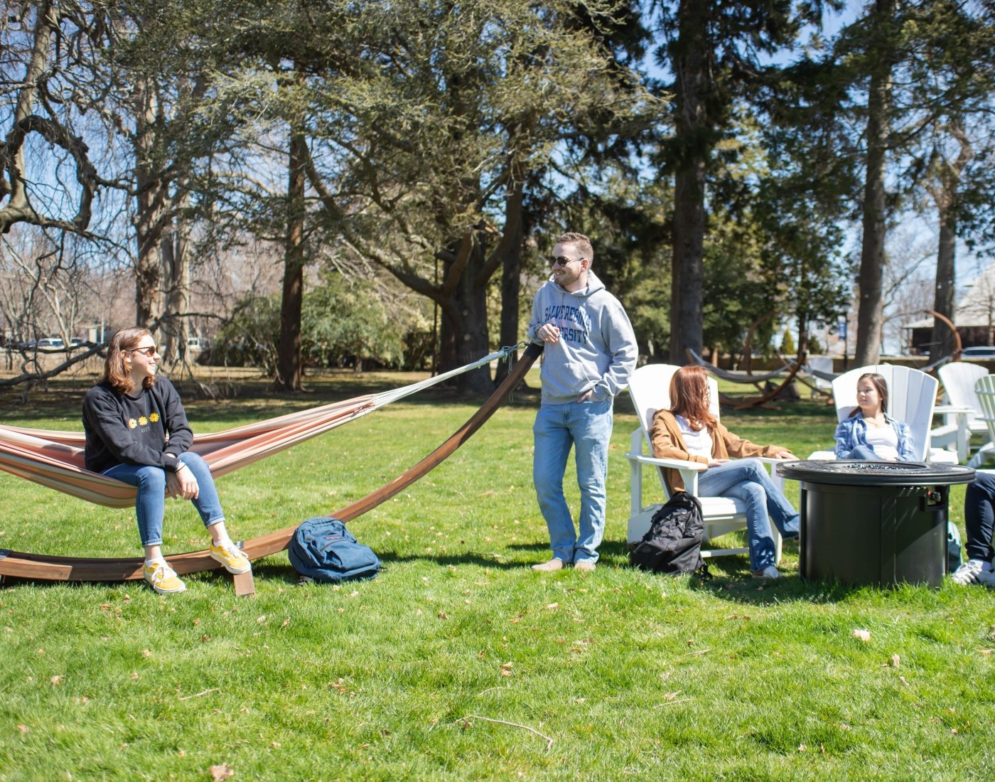Students socializing outside in chairs