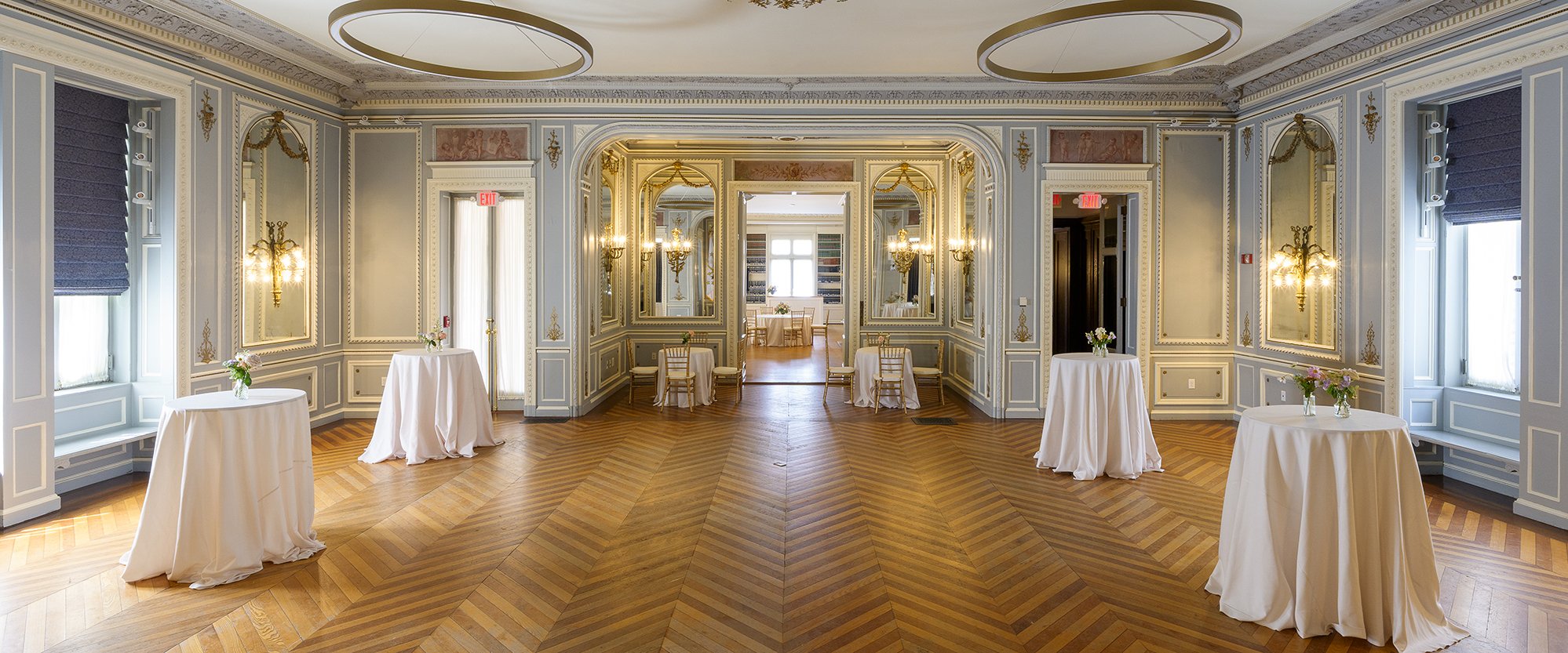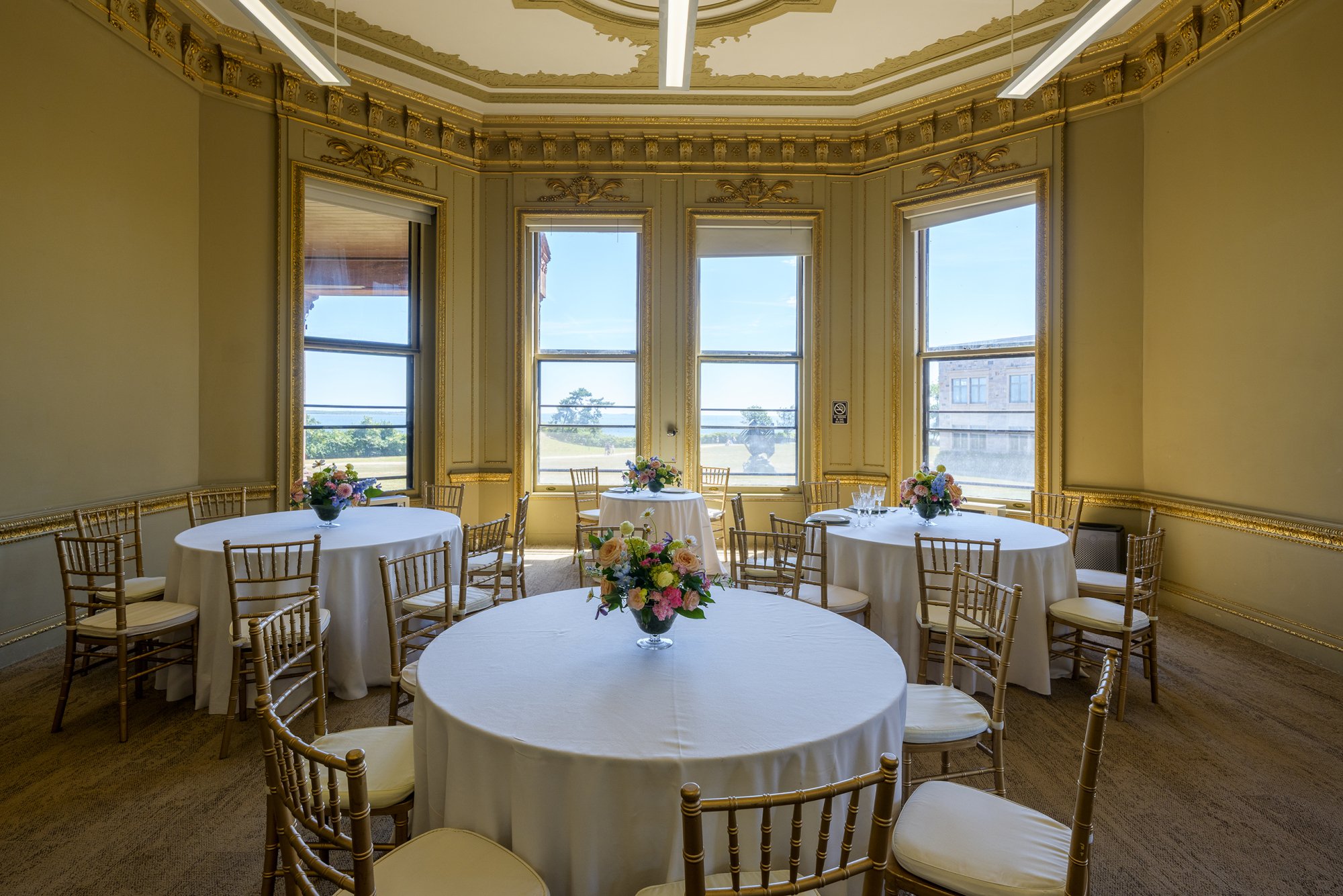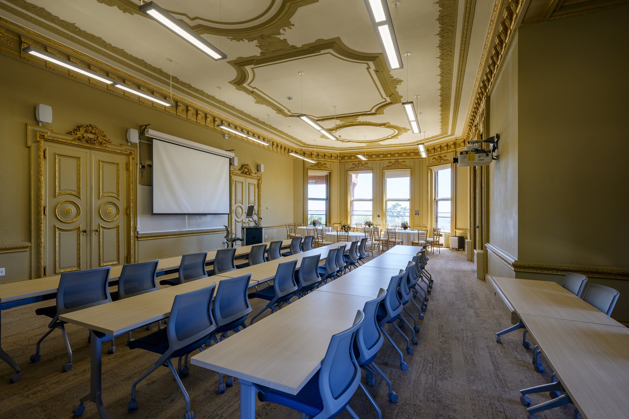 Set at the edge of campus on the famed Bellevue Avenue, the Young Building is as well known for its history as its design. Wrought iron gates and a mosaic-tiled floor at the front entrance lead to the great hall with its beautiful carved staircase. The dining room, paneled in dark carved wood under an ornamental ceiling, seated up to 100 guests. Benjamin Harrison’s vice president, Levi P. Morton, bought the property in the late 1860s and commissioned Richard Morris Hunt, designer of Ochre Court, to build a ballroom on the south side. You can book the entire building, which includes residential rooms, a boardroom and two elegant rooms that can be used lecture style or for a conference, gala dinner or reception.
